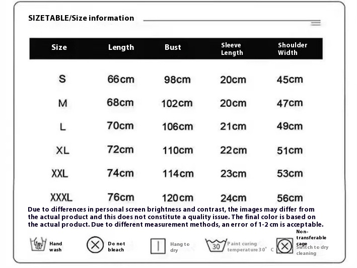 1. Asian sizes are 1 to 2 sizes smaller than European and American people. Choose the larger size if your size between two sizes. Please allow 2-3cm differences due to manual measurement. 2. Please check the size chart carefully before you buy the item, if you don't know how to choose size, please contact our customer service. 3.As you know, the different computers display colors differently, the color of the actual item may vary slightly from the following images.